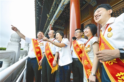 7月20日,首批300名劳模高兴地登上天安门城楼参观游览。参加本次休养活动的劳模大多来自生产一线,他们除在京参观游览天安门、国家大剧院、颐和园和奥运场馆外,还将赴北戴河海滨参观休养。