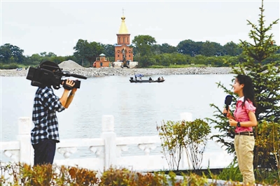 7月20日,媒体记者在以黑瞎子岛为背景进行拍摄报道。