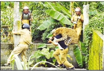 7月19日,一只生活在自然保护区中的美洲豹误闯入印度北方邦西里古里市一个村庄,7名村民遭袭受伤,最终美洲豹被当地林业部门工作人员擒获。图为美洲豹扑向工作人员。阿健 供图