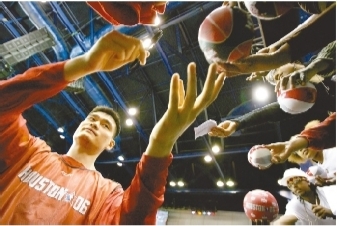2006年2月18日,参加2006NBA全明星赛的休斯敦火箭队球员姚明(左)在训练前为球迷签名。 新华社记者