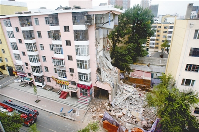 7月21日凌晨,哈尔滨市南岗区联部街58号居民楼部分墙体发生垮塌事故,未发现人员伤亡。据了解,58号楼北侧有一栋二层建筑施工,在施工过程中,将58号楼北侧山墙基础扰动,导致该楼北侧门洞上方二层至六层一个开间整体坍塌。由于事件发生时征兆明显,楼内居民全部及时撤离,没有造成人员伤亡。小刚 摄