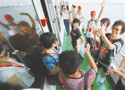 7月22日上午,在北戴河海滨休养的300余名劳模登上游船出海游览渤海景色。许多来自西部和生产一线的劳模是第一次见到大海,他们高兴地在甲板上唱起了歌,跳起了舞,以表达他们对党和政府对广大劳模关心体贴的感激之情。本报记者 张宪 摄