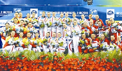 7月21日,俄罗斯队(中)、中国队(左)和加拿大队在颁奖仪式上。当日,在第14届国际泳联世锦赛花样游泳自由组合决赛中,俄罗斯队以98.470分的成绩夺得冠军,中国队和加拿大队分别以96.390分和96.150分的成绩获得亚、季军。新华社记者 杨磊 摄