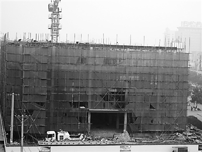 7月4日上午8时,在当地群众的指点下,记者来到位于山东临沂市罗庄区罗四路与宝泉路交汇处的施工现场。记者看到,一辆重型卡车正往下卸着建筑用混凝土,塔吊车在作业,工人们在脚手架上紧张地施工。抬头望去,大楼第三层已经封顶。