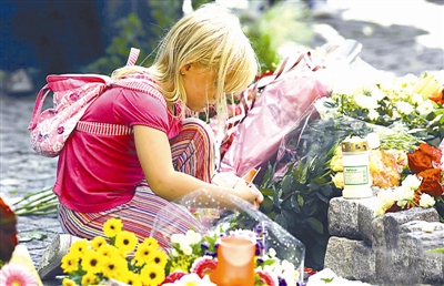 7月23日下午,一挪威儿童在奥斯陆市中心祭奠逝者。沈晨 供图