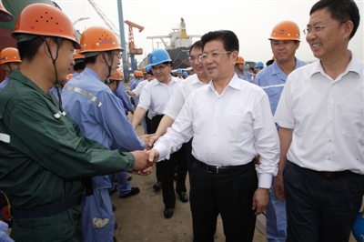 7月23日至25日,中共中央政治局委员、全国人大常委会副委员长、中华全国总工会主席王兆国在大连考察工作。图为王兆国看望大连船舶重工集团的劳模和职工代表,并与大家亲切交谈。石险峰 摄
