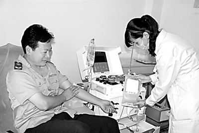7月21日上午,被誉为红盾志愿者的河南平顶山市工商局卫东分局职工何栓岗,又一次来到血站,捐献出了一个机采量的血小板(相当于800cc的血浆)。至此,13年来何栓岗已累计无偿献血7800毫升。郑 巍 古国凡 摄