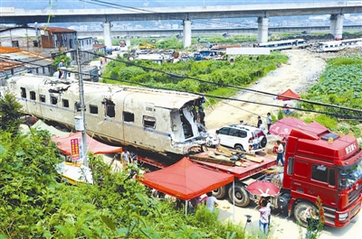 7月26日,载重车装载事故车准备离开现场。新华社记者 徐昱 摄