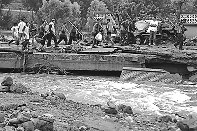 7月25日,一场大暴雨带来的山洪,卷走了北京密云县四村民,导致两死一失踪。图为密云县大城子镇一处被雨水冲垮的桥梁和破碎的柏油路。