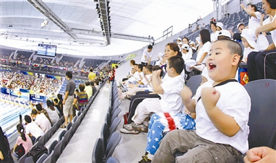 7月26日,听障儿童在为运动员加油助威。当日,旨在让听障儿童感受精彩世游赛的“观摩世游盛会,泳动爱心一夏”主题活动在上海举行。40多位听障儿童走进梦想已久的世游赛场,近距离观摩泳坛健儿的英姿,感受水中运动的魅力。新华社记者 凡军 摄
