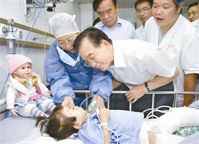 7月28日,中共中央政治局常委、国务院总理温家宝来到浙江温州,察看“7·23”甬温线特别重大铁路交通事故现场,悼念遇难者,看望受伤人员,慰问遇难者亲属。这是温家宝特地来到温州医学院附属第二医院看望小伊伊。两岁零八个月的小女孩项炜伊是这起事故最后一名获救者。