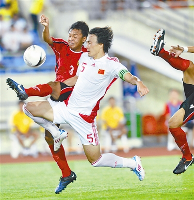 7月28日,中国队球员杜威(左二)与老挝队球员姆古达·苏萨瓦拼抢。当日,在老挝万象国家综合体育场举行的2014年巴西世界杯足球赛亚洲区预选赛第二轮次回合比赛中,中国队以6比1战胜老挝队。
