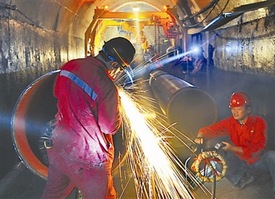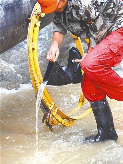许多地段的电焊工要趟水作业,在施工中倒灌进雨靴里的水令人烦恼。7月16日摄于秦岭管道建设工地