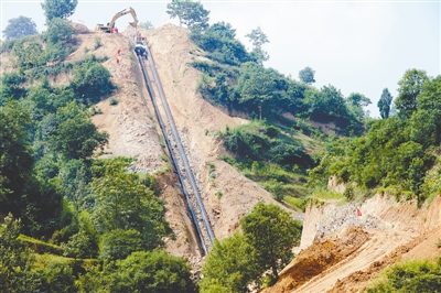 兰成中贵管道康县檐望台,斜坡角度为35度,是秦岭全线最陡的施工路段之一。7月18日,摄于秦岭线施工现场