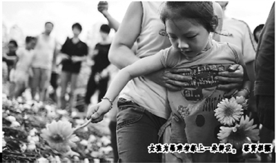 女孩为罹难者祭上一朵鲜花。 蔡贤敏摄