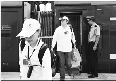 7月30日,在拉萨火车站,参加“同心·共铸中国心西藏行”大型公益活动的医疗专家走下火车。