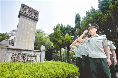 7月31日,浙江台州的边防官兵在烈士纪念碑前重温入伍誓词。当日,浙江省台州市椒江边防大队组织官兵来到烈士陵园,缅怀革命烈士,重温入伍誓词,迎接“八一”建军节到来。 郏策 摄