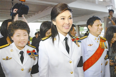 8月1日,在泰国首都曼谷,为泰党总理候选人英拉·西那瓦(中)抵达会场,准备参加新一届国会第一次召集会议。