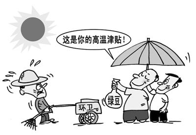 7月25日,湖南长沙的大街上热浪滚滚。环卫工人宁大爷,戴着遮阳斗笠,推着垃圾车,沿路清扫垃圾。“哪有什么高温补贴哦,倒是领了5斤绿豆和5斤白糖,还有一包板蓝根等药品。”面对记者的提问,农民工宁大爷一边用毛巾狠狠地擦着脸上的汗水,一边无奈地回答。“下午1点就上街清扫垃圾了,太阳晒得喘不过气来,一天能喝四五升水。”(人民网)