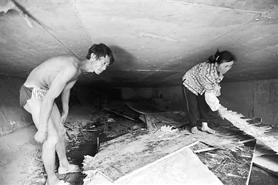 2011年7月26日,武汉,在建的二环线发展大道高架桥桥面下,汪校忠一家四口正在进行拆梁施工。汪校忠和妻子弯曲着身子在箱梁内工作。程铭/摄