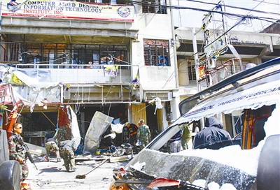 2日,调查人员在菲律宾南部城市哥打巴托发生爆炸的地点勘查。菲警方2日说,该市当天下午发生一起爆炸事件,造成1名平民死亡,10人受伤。 新华社发(杰夫·麦戴姆 摄)