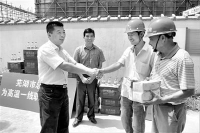 7月29日,安徽省芜湖市人大常委会副主任、市总工会主席韩卫民带领市总工会机关干部前往市重点工程建设单位,慰问高温下坚持工作的一线职工,为他们送去了防暑降温用品。据悉,芜湖市总工会筹集的价值14万元的防暑降温用品将于近日全部发放到市政、交通、供电、供水、园林等单位的一线职工手中。