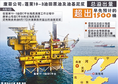 据新华社北京8月3日电(记者胡俊超 王宇)今日,记者从康菲石油中国有限公司获悉,在蓬莱19-3油田C平台海底清理工作过程中,康菲公司在C平台附近海底发现还有剩余来自6月17日井涌事故所溢出的油基泥浆,目前尚无法估计海底剩余油基泥浆总量,但估计这会导致原油及油基泥浆总溢出量超出早先预计的1500桶。