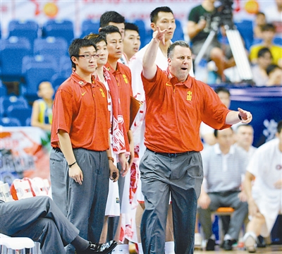 8月3日,中国队主教练邓华德(前右)在场边指挥。当日,在浙江海宁举行的斯坦科维奇杯洲际篮球赛海宁站比赛中,中国队以62比69负于澳大利亚队。