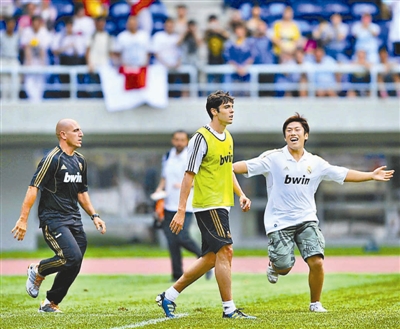 8月4日,一名闯入场内的球迷(右一)奔向卡卡。当日,西班牙皇家马德里队在天津奥体中心举行公开训练,到现场观看训练的个别球迷跳入场内,向偶像索要拥抱和签名。
