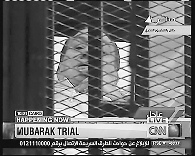 法庭设在警察学院礼堂,一道围栏把被告家属和其他听众隔开。被告席被一个黑色金属笼罩住,用钢丝防护网包裹,靠近被告家属所处区域,足以防止示威者家属“空袭”穆巴拉克等人。
