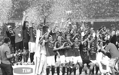 8月6日晚,第24届意大利超级杯在北京国家体育场“鸟巢”展开角逐,意甲冠军AC米兰2比1逆转击败意大利杯得主国际米兰,创造6次夺冠的新纪录。图为AC米兰队颁奖时的情景。本报记者 许之丰 摄