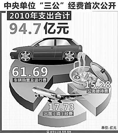 国务院关于2010年中央决算的报告显示,2010年中央行政单位、事业单位和其他单位的“三公”经费支出合计94.7亿元。其中,出国(境)经费17.73亿元,车辆购置及运行费61.69亿元,公务接待费15.28亿元。中央政府率先公开“三公”经费,被认为是财政信息公开的重大突破。 图片来源:新华社