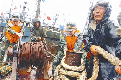 8月8日,辽宁海警第二支队官兵在东港市码头帮助渔民加固渔船。