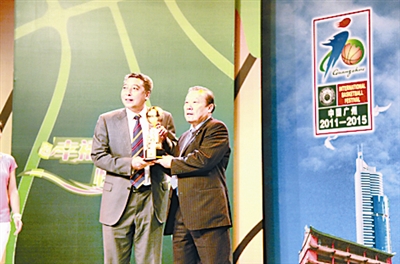 8月7日,在乔丹公司赞助的2011首届广州国际篮球节国际高端论坛暨颁奖盛典上,国际篮联终身荣誉主席程万琦(右)获得了国际篮球卓越贡献奖。陈瑞 摄