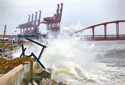 8月8日,辽宁省大连市。受台风“梅花”影响,大连福佳大化(PX项目)附近防波堤被冲毁,海水倒灌厂区,生产用化工储罐受到威胁。笔者8日15时左右在抢险现场看到,大量的十字形防波堤专用混凝土构件和巨石,正通过上百辆大型运输车,源源不断地运抵现场并投入到海里,从而使溃堤的缺口得到修补,以挡住海水对储油灌区及其PX厂区的威胁。防波堤溃堤风险目前得到有效控制。不老海 摄