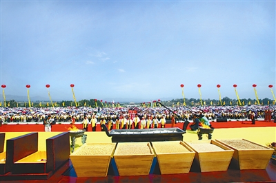 8月9日,第四届海峡两岸同胞共祭“中华三祖”大典在河北涿鹿举行。来自海峡两岸近万名同胞共同祭拜了中华民族三大文明始祖——黄帝、炎帝、蚩尤。此次祭祖活动由国务院台湾事务办公室、河北省人民政府主办。本报记者 李昱霖 摄