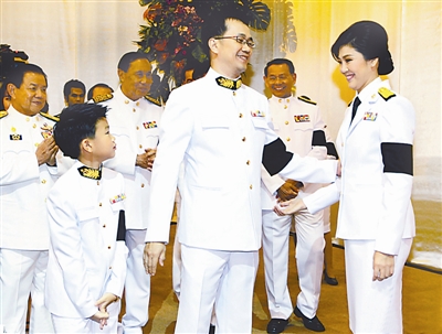 8月8日,新近当选为泰国首位女总理的为泰党领导人英拉得到泰国国王普密蓬御准,正式成为泰国第28任总理、历史上首位女总理。图为英拉与丈夫和儿子在一起。阿健 供图