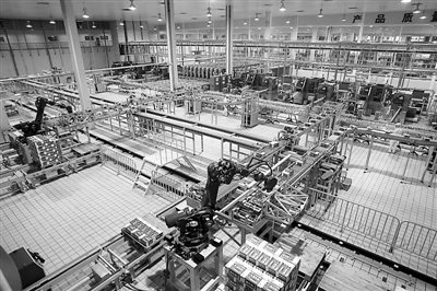 这是蒙牛乳业集团公司液体奶全自动生产车间的生产情景。该车间整个流水线每小时能生产2万盒液态奶,也就是说一眨眼的工夫就会有2到3盒的成品奶下线。在这样一个大型的生产车间内,很少能看到工作人员,基本上实现了机械化,由机器人替代人工完成工作,就连成品奶到仓库的运输,都是由电脑控制运输车完成的。由于充分运用了高科技,在该生产车间里看不到一滴牛奶。 宋安/摄