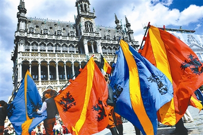 8月9日,在比利时首都布鲁塞尔的大广场,路人观看“五月树”游行中的旗舞表演。