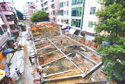 8月9日,广州天河员村南社大街附近交叉路口位置,一块数百平方米的建筑工地上,多名工人正在对一层地基进行土地平整。整片工地由中间划分为两块,四周用简易的木板遮挡封闭,临街一侧刚刚将地基浇筑完毕,另一侧已经将一层混凝土梁架搭建好。作为广州CBD延伸区的天河员村,相关城中村整改征求意见后,村里出现多处抢建现象。