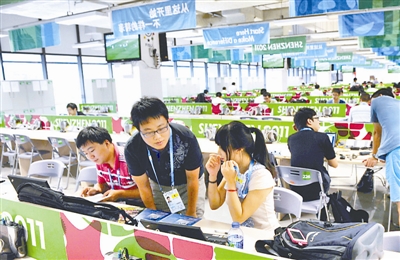 2011深圳大运会吸引了来自世界各地的众多媒体记者的关注。图为本届大运会主媒体中心的文字记者工作间里繁忙的景象。本报记者 许之丰 摄
