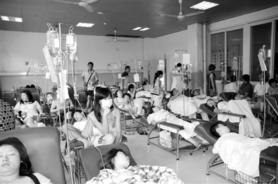 江西瑞昌市,一个紧临长江、隔鄱阳湖上百里、城区只有13.8万人的小城,不产“鄱阳湖龙虾”,却耗资600余万元大张旗鼓地办起了“首届鄱阳湖龙虾节”,结果想“造势”却“肇事”,200多人参加“万人龙虾宴”导致急性肠胃炎入院治疗,百姓怨声载道。这是食用龙虾后感觉不适入院的患者们(8月12日摄)。 新华社记者 李美娟 摄