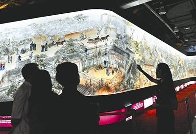 8月14日,几位游客在北京国家会议中心参观“老北京动起来”多媒体数字艺术展览。在这次展览中,展出了有着“当代清明上河图”之称的精美长卷《旧京环顾图》,画面生动地再现了老北京人生活的场景和独特的韵味。本报记者 张宪 摄