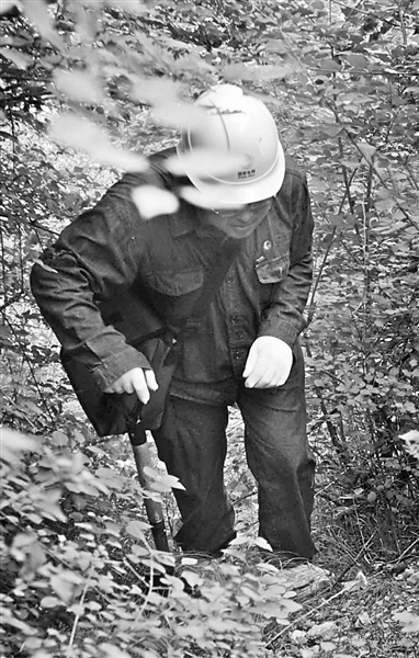 从山脚到山顶,根本没有路,满是半人高的杂草和枝桠横生的灌木。身体前倾,左手拄着拐杖,右手不断地挥舞砍刀砍断杂草和灌木。大滴的汗水从脸颊上滑落下来,浸润着孤寂的大山。