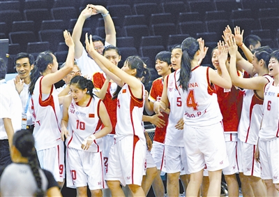 8月14日晚,在深圳大运会女子篮球预赛A组第5场比赛中,中国队以71比59战胜立陶宛队。图为中国女篮队员们庆祝胜利。