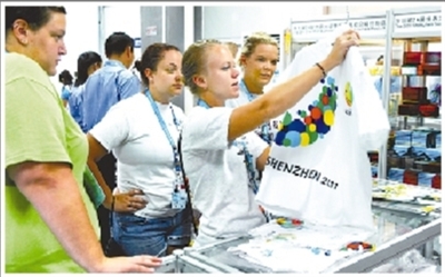美国运动员在大运村专卖店里挑选大运会纪念T恤。 本报记者 许之丰 摄