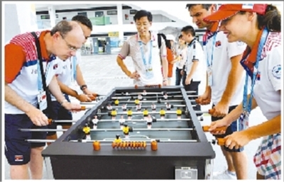 来自塞尔维亚的运动员,在大运村的桌式足球台前玩得很投入。本报记者 许之丰 摄