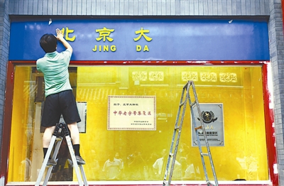 图为街道办事处工作人员在前门大栅栏商业街安装宣传橱窗。