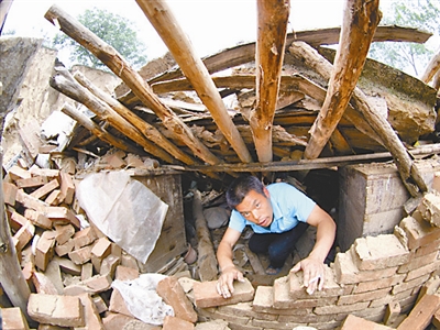 村民秦永明试图挖出被坍塌的房子埋住的摩托车,最后无奈地又从瓦砾中爬出来。