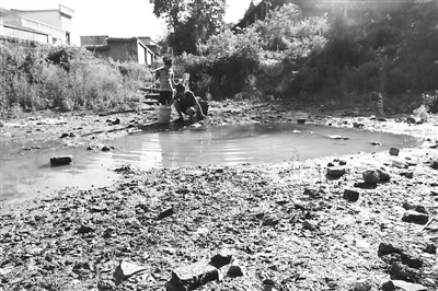 8月18日,湖南娄底市娄星区双江乡义坪村村民在快干涸露底的池塘里舀水,准备浇地抗旱。
